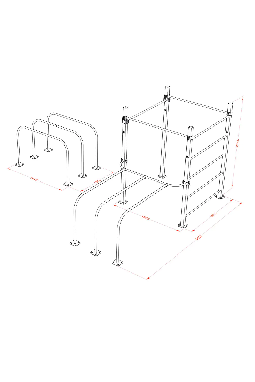 - Configuration: integrated wall bars, internal parallel bars, and external parallel bars