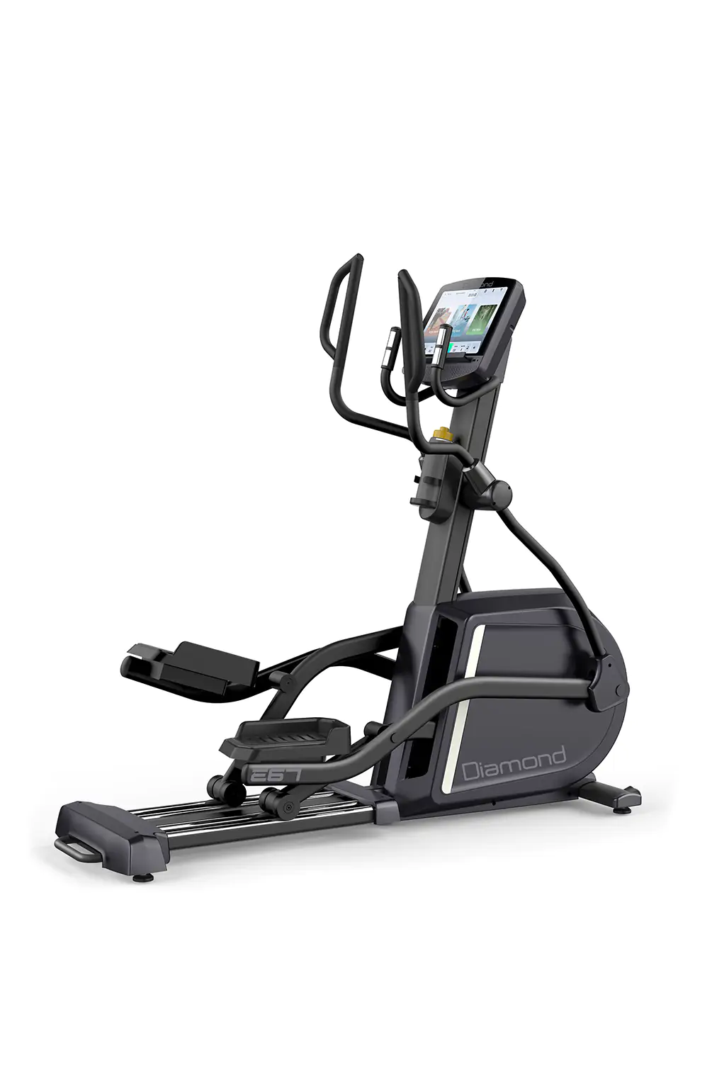 La elíptica E67 by Diamond es la cima de la gama profesional y combina un diseño refinado con una mecánica confiable y tecnología avanzada para ofrecer una experiencia de entrenamiento superior. Una verdadera elíptica con características específicas: ajuste de inclinación (power incline) que incrementa el esfuerzo en las plataformas; paso amplio de 56 cm (stride) para movimientos profundos; sistema de frenado EMS (inducción) que determina una zancada extremadamente fluida y constante a todas las velocidades. El robusto chasis permite alojar a bordo personas de hasta 170 kg encontrando siempre la posición correcta con el máximo confort. La elíptica está equipada con una consola moderna con pantalla TFT táctil de 15,6", con conexión Wi-Fi integrada para entretener a cada usuario, ¡incluso a los más exigentes! La elíptica ergómetro E67 by Diamond representa una combinación perfecta entre excelente rendimiento, multimedia y máximo confort durante el ejercicio. Con su diseño elegante y consola interactiva, ofrece la posibilidad de realizar un entrenamiento atractivo y motivador necesario para alcanzar el bienestar físico. ¡La nueva elíptica E67 es la compañera ideal para evolucionar tu forma de entrenar!